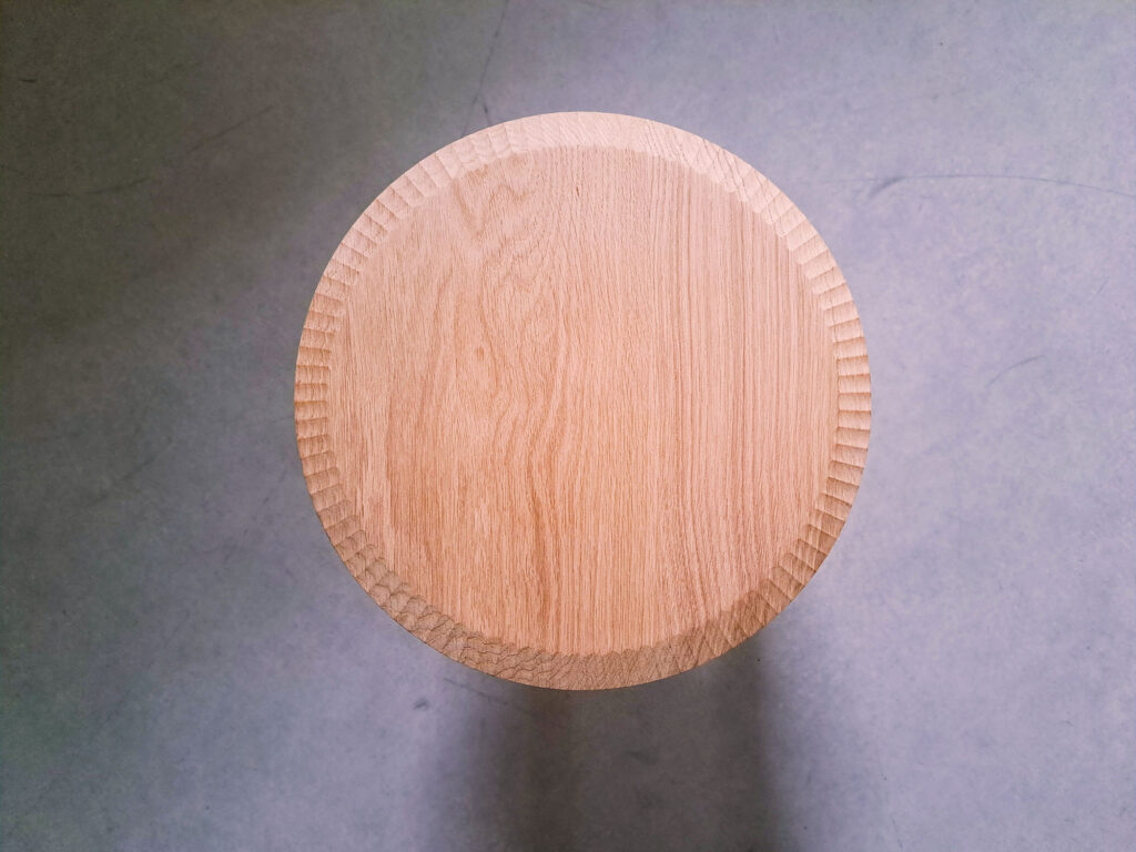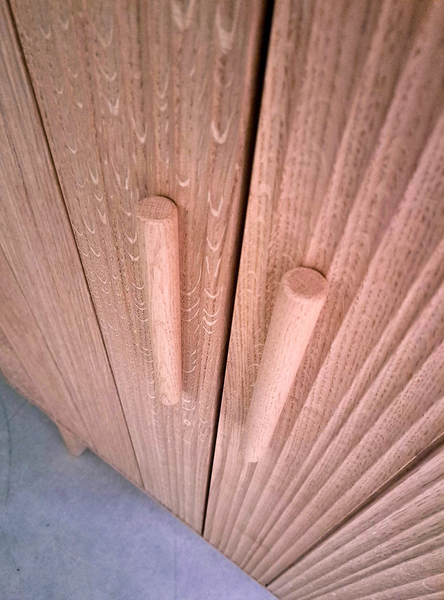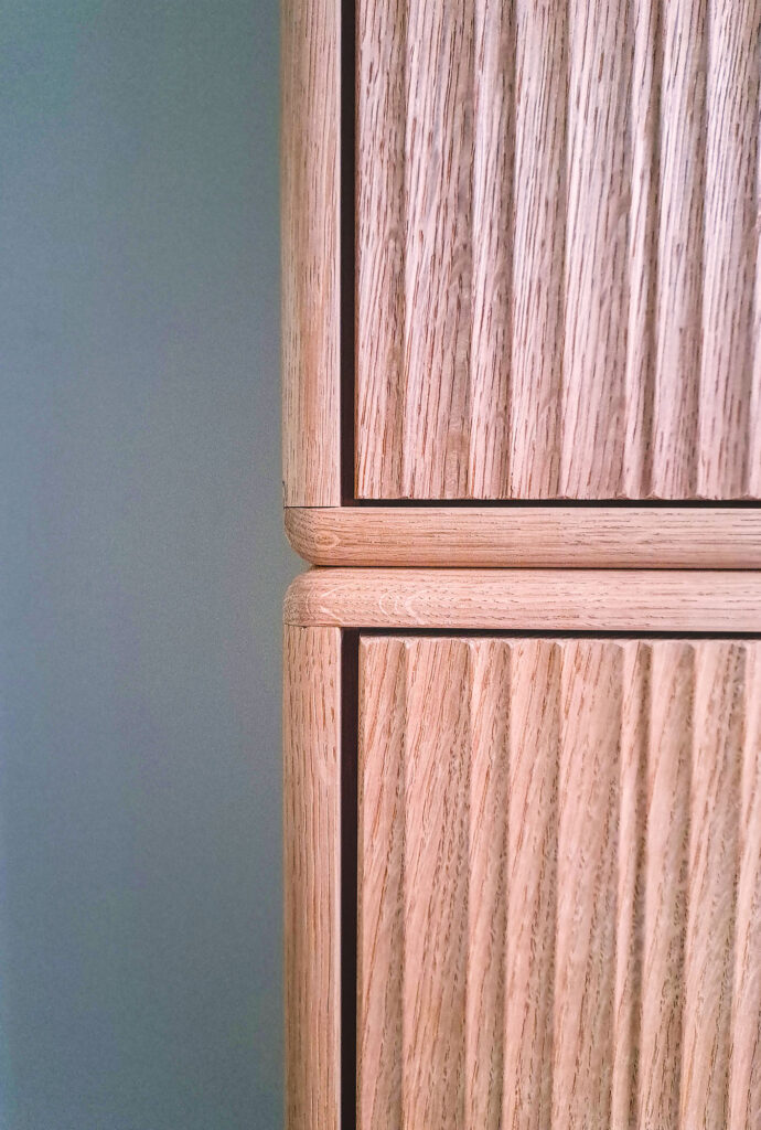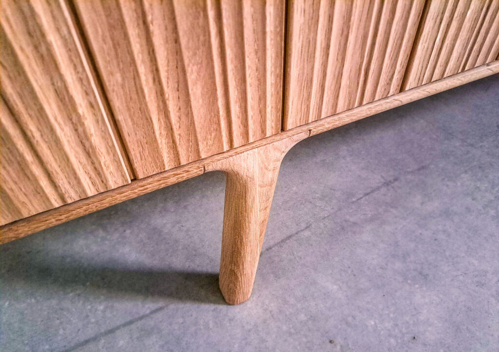 Möbel aus massivem Eichenholz. Dieses Mal ist die Fräsmaschine ausschlaggebend für das Design. Ohne sie wäre es nicht möglich, ein solch rhythmisches Muster aus schmalen und breiten Rillen auf den Fronten zu erzielen und solche in die Sockelleiste eingearbeiteten Füße.