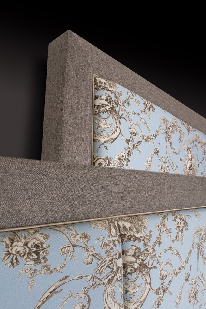 Die Kopfteile Boétie und Rêveries spiegeln deutlich die gegenseitige Befruchtung von früher und heute wider: ein minimalistischer Rahmen mit klassisch inspirierter Ausgestaltung. Die exklusiven Stoffkollektionen wurden in Zusammenarbeit mit Maison Thévenon, einem französischen Familienunternehmen (1908), entwickelt, das für seine außergewöhnlichen Interieurstoffe (Möbel, Vorhänge) berühmt ist. Die Kollektion Ludivine besteht aus legendärem Toile-de-Jouy in traditionellem Blassblau und Rostbraun. Toile de Jouy? Die Geschichte dieses Stoffes reicht bis ins 18. Jahrhundert zurück. Damals bedruckt mit idyllischen Bildern aus dem Leben auf dem Lande oder mythologischen Szenen, jetzt für Le Sommeil Français mit vom kulturellen Erbe inspirierten klassischen oder floralen Mustern. Dem gegenüber steht die überschwänglichere Kollektion Pondichéry: ein dekorativer Stoff in intensiven Farben. Entworfen wurde er vom Studio Inkfabrik, nach eigenen Worten „ein Pariser Duo aus Berlin“.