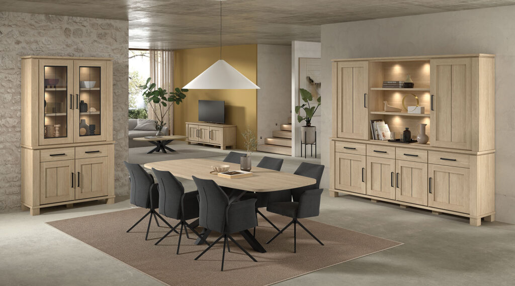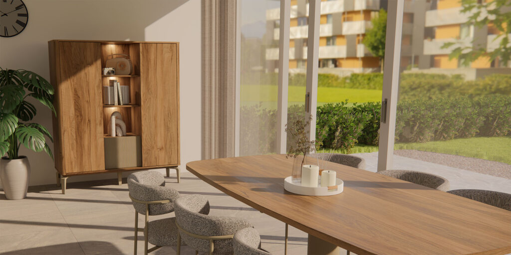 Weniger Wand? Dann verlagern Sie den Fokus doch von der Raumbreite auf die Deckenhöhe. So holen Sie das Maximum aus der verfügbaren Wandfläche heraus. Sideboards erhalten einen Aufsatz, vorzugsweise teilweise offen/transparent für einen leichten und luftigen Effekt. Diese Lösung eignet sich hervorragend für (halb-)klassische Stile wie das Alba-Programm.