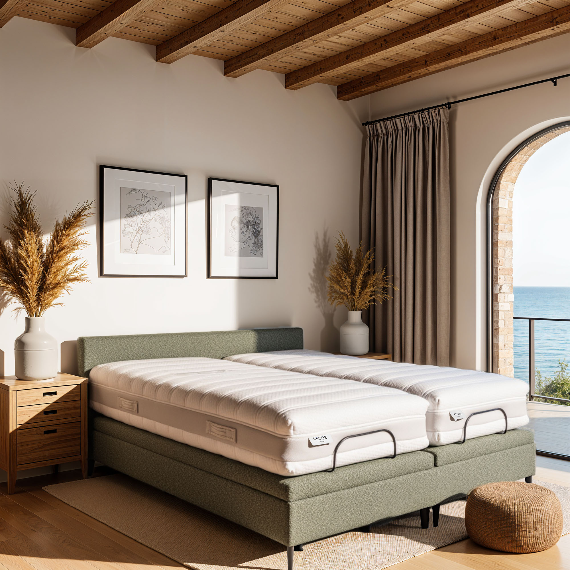 Blick voraus auf Brüssel 2025: Keine Rede mehr von Optionen. Die Funktionen findet man jetzt serienmäßig bei allen elektrischen Bettböden von Recor Bedding. Die Idee: Jeder hat das Recht auf „Smart“ in der besten Form. Der Verkaufsprozess verläuft ohne (preisbedingtes) endloses Zweifeln über technische Optionen. Elektrisch bedeutet einfach „alles inklusive“. Die gesamte Aufmerksamkeit gilt der Formgebung und dem Styling Ihres Betts: dem Wave-Konzept. Das ist eine Frage von Geschmack und Budget. Wie weit will/kann man gehen? Das ist der Gegenstand des Verkaufsgesprächs, hier können Sie punkten. Die äußere Gestaltung soll aber kein Hindernis sein. Deshalb gibt es in Brüssel ein freistehendes Smart-Bett auf Design-Füßen, das Einstiegsmodell.