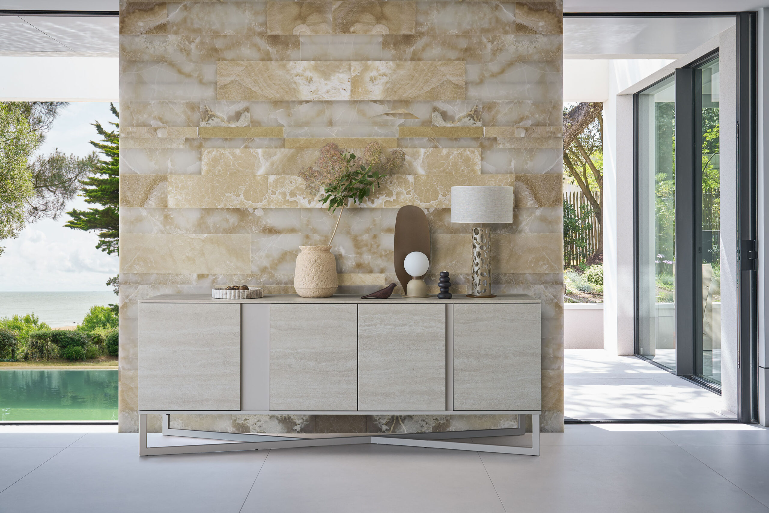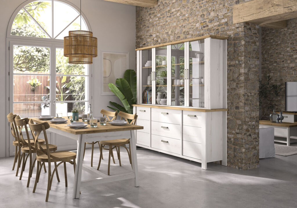 Das Wohnprogramm Audace zeichnet sich durch seine aparte Asymmetrie aus, ist genau das kleine bisschen anders proportioniert. Die Flächenaufteilung der Fronten (Drehtüren) wirkt zufällig, ohne feste Regeln. Das Untergestell besteht aus einer perfekten Diagonale und zwei unterbrochenen parallelen Linien. Der neueste Look für Audace besteht aus Eiche im Farbton Aschgrau und einer Travertinausführung.