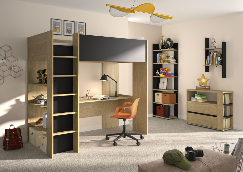 Ein vertrautes Bild bei Gautier ist das Jugendzimmer. Nael ist ein Spin-off des Erfolgsprogramms Duplex. Die Mezzanin-Aufstellung ist die ideale Lösung für junge Erwachsene. Unter dem Bett wurde ausreichend Platz für einen vollwertigen Arbeitsplatz geschaffen — ohne sich bücken zu müssen (Hochbett).