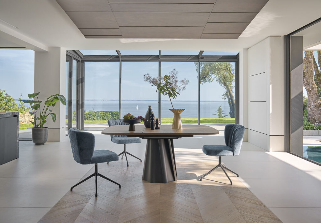 Das französische Flair fällt beim Tisch Twist sofort ins Auge. Die Tischplatte ruht auf einem statuenhaften Säulenfuß aus Metall. Seine Struktur ähnelt dem Faltenwurf eines bodenlangen Tischtuchs, das sich in einer leichten Drehbewegung zu befinden scheint. Mit etwas Fantasie sieht man die Hand, vorsichtig drehend, Bei der Arbeit. Die Tischplatte ist synchron von 118 auf 166 cm ausziehbar.