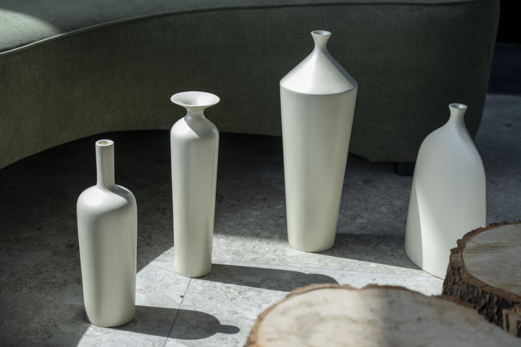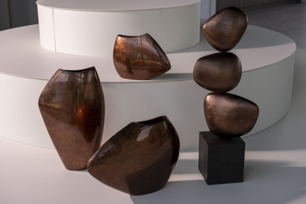 Die Palette der dekorativen Objekte umfasst stilisierte Vasen, Flaschen, Schalen und Skulpturen. Design und Farben sind tief in der Natur verwurzelt. Die elegante Einfachheit ist geformt durch das Fließen der Natur, durch die nie endenden Bewegungen von Wind, Wasser, Licht und Schatten. Die „in sich drehenden“ Skulpturen wie Cirro und Solar können als DIE Stilikonen der neuesten Kollektion gelten. Lackiert ist das von der Natur inspirierte Design in tiefverwurzelten natürlichen Farben aus der Erde (Metall), vom Boden (Herbstblätter). Das heißt warmes Kupfer, Rost, zartes Rot und noch etwas sanfter: pfirsichfarben. Was die Symbolik betrifft: Erdtöne, sich erden, seine eigenen Wurzeln fühlen, zur Ruhe kommen. Dieser Augenblick des Einhaltens! Wenn man sich die Zeit nimmt, die Details anzuschauen: die haarfeinen Linien, die über den Lack verlaufen. Wenn man weiß, dass sie freihändig, mit einem messerscharfen Bambusstöckchen gezeichnet sind. Das lässt einen still werden.